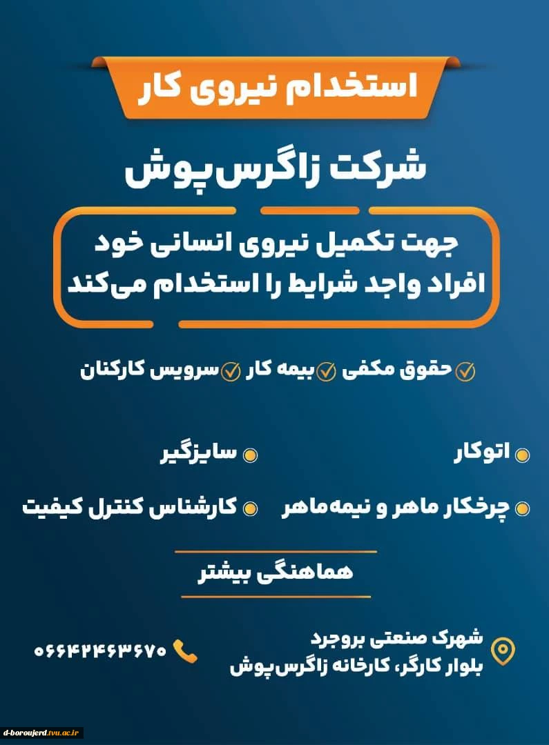 امتیاز دهید : آگهی استخدام دانشجویان فارغ التحصیل و ترم آخر آموزشکده دختران بروجرد در کارخانه زاگرس پوش بروجرد 2 چهارشنبه 5 آذر 1404 ساعت 15:14